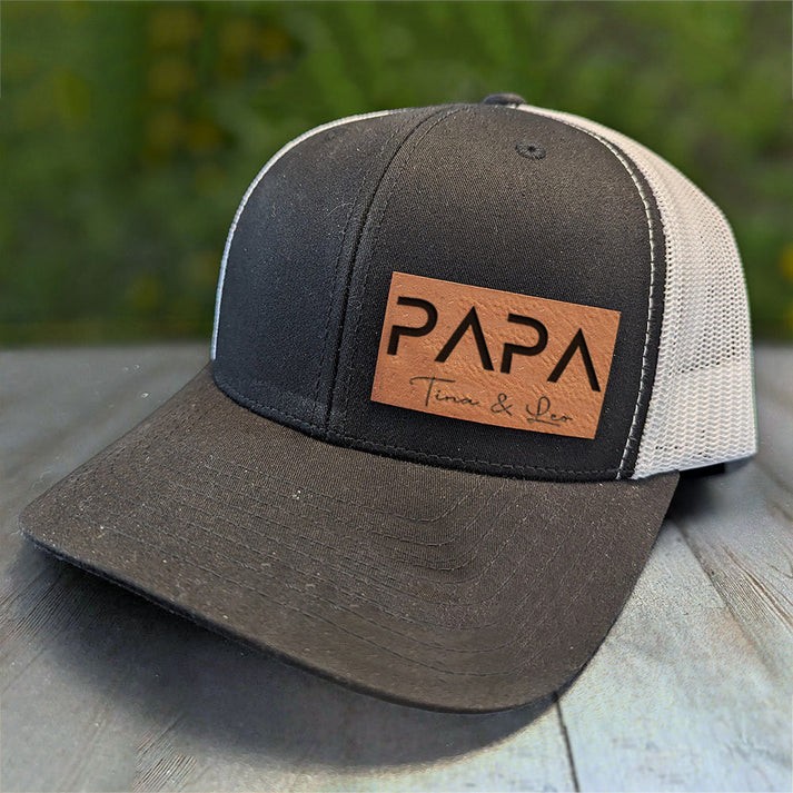 Personalised Dad Hat with Kids Names Leather Patch Trucker Hat Father's Day Gift